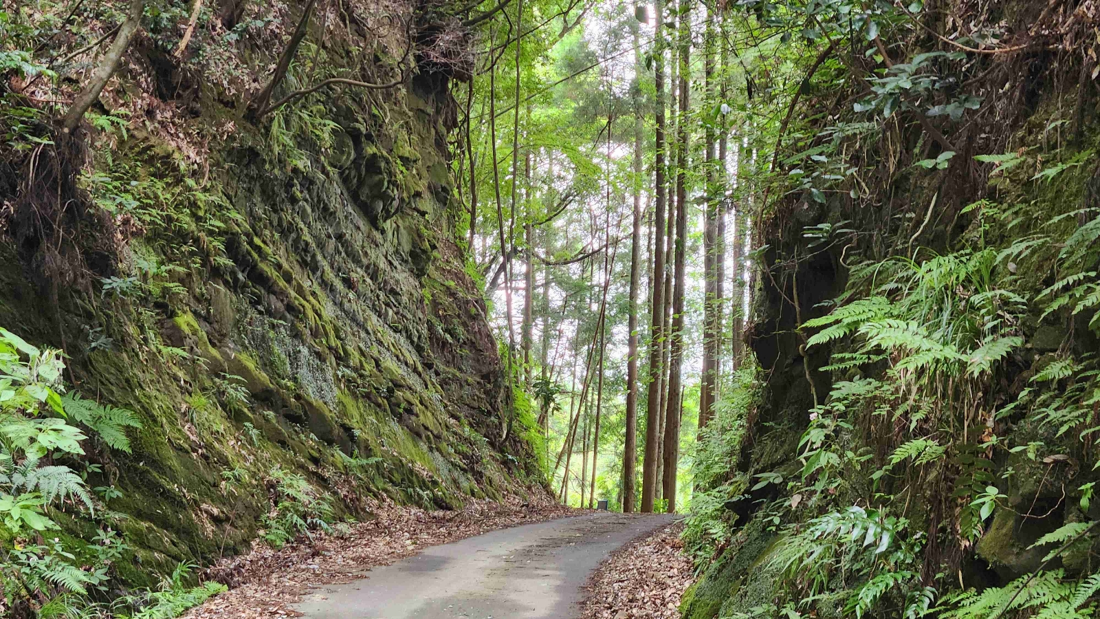 迫力溢れる崖の合間を行く小さな林道。