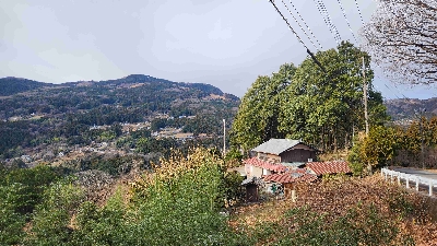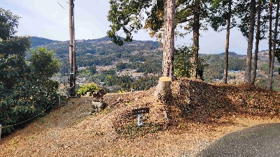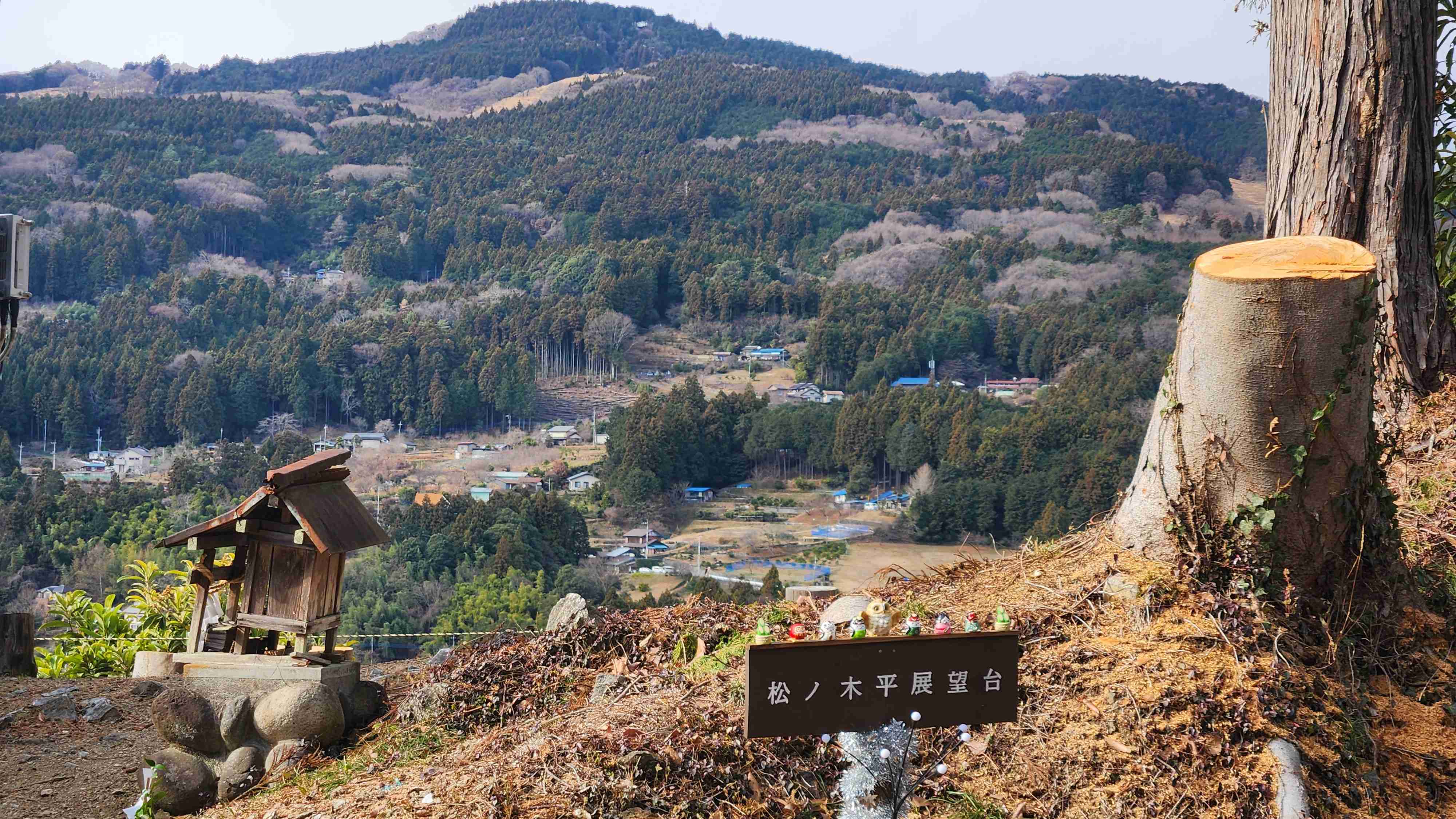 笠山へ向かう林道の途中にある展望台。反対の斜面に広がるさまざまな山間集落が見渡せる。