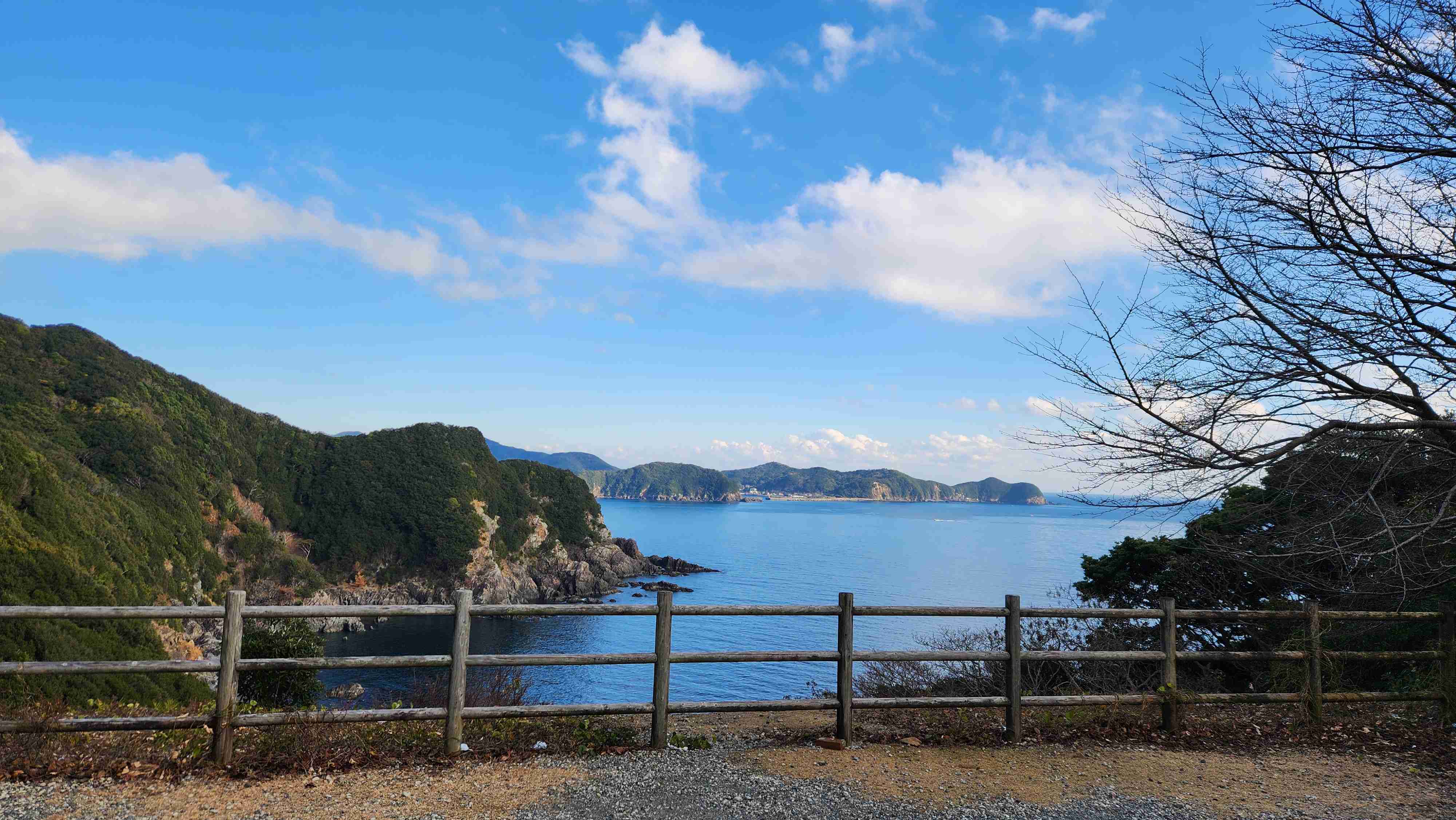 礫浦を一周する道の途中にある小さな展望台。南海の険しい海岸線を眺められる。