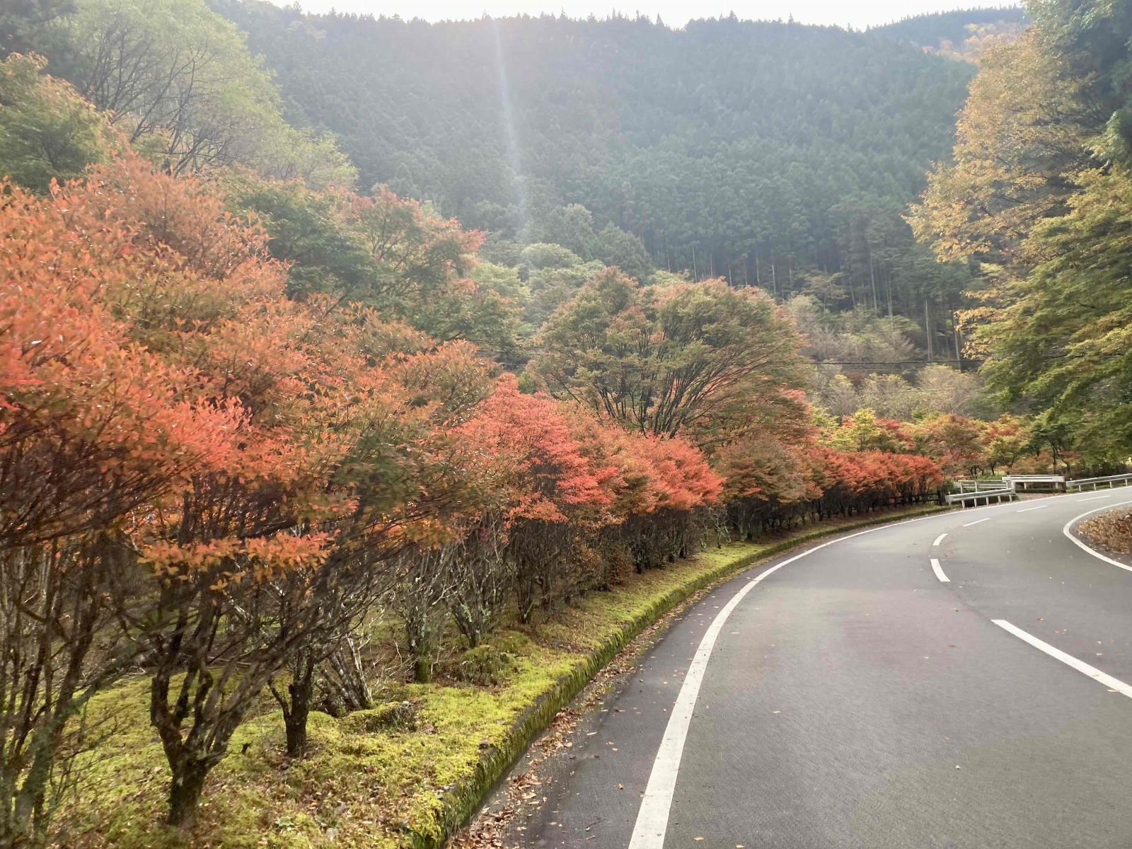 寸又峡温泉に向かう最後の直線はもみじに囲まれており、11月になると綺麗なオレンジ色に染まる。