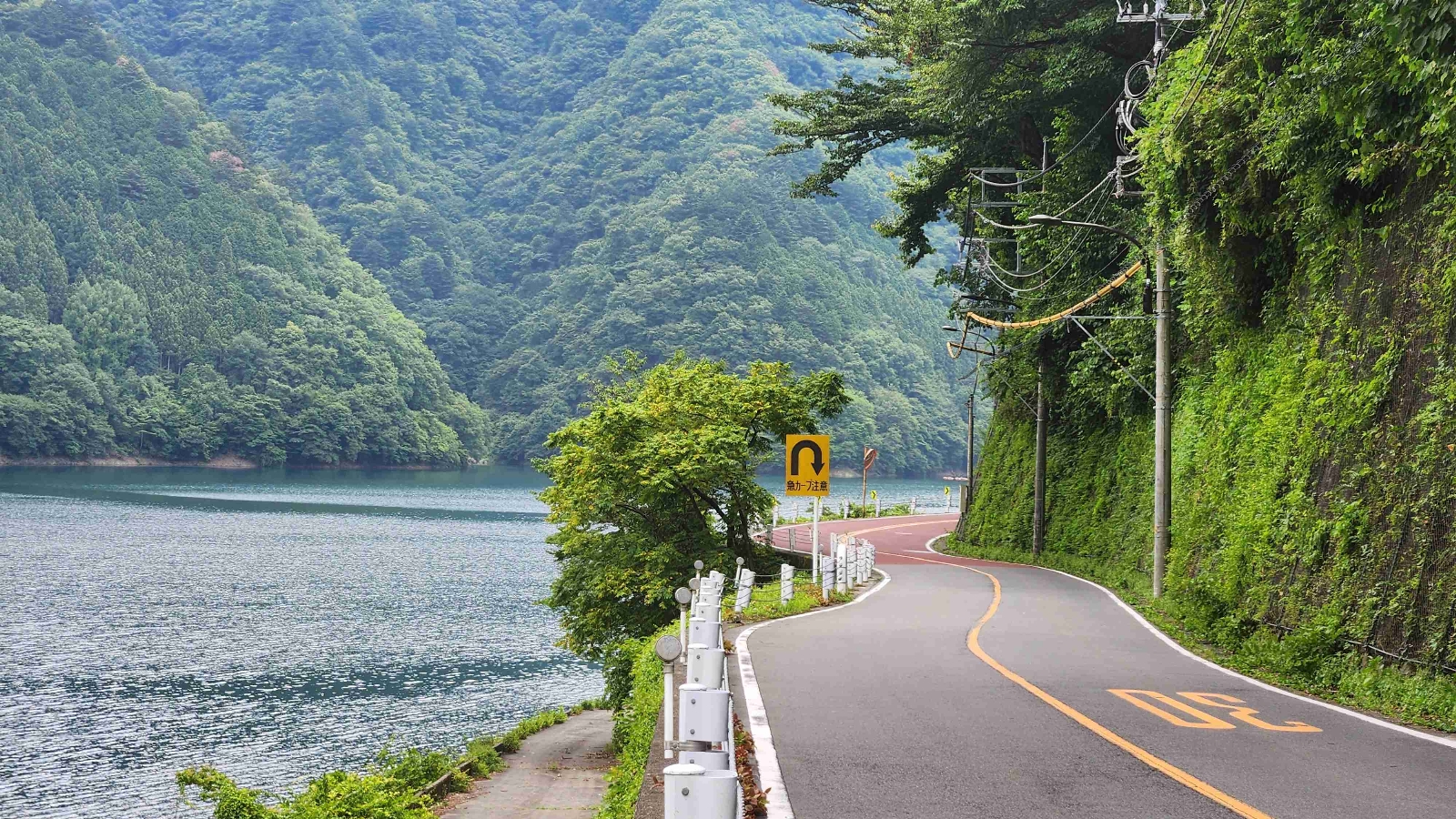 ここまでずっと続いた登り道とトンネルの連続が終わると、広がるのは奥多摩湖。周辺の山々が映る水色の湖面はとにかく美しい。