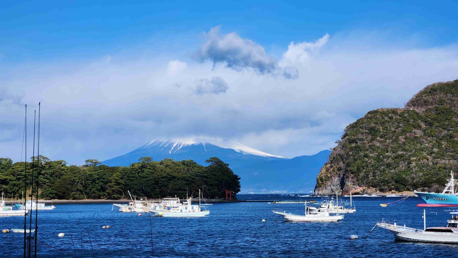 美浜岬、諸口神社の鳥居、出逢い岬の崖と雄大な富士山を一緒に楽しめる絶景スポット。西伊豆を代表する風景の一つ。