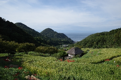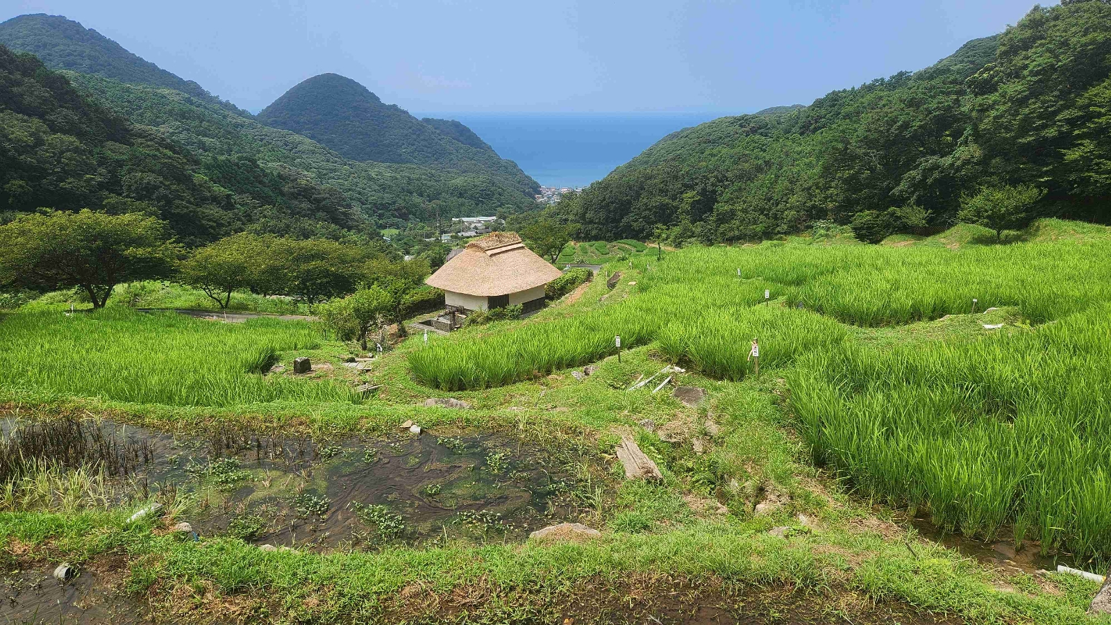 山の一面に広がる棚田から、駿河湾まで一望できる絶景。田植えの時期や稲刈りの時期はもちろん、冬季には河津桜、そして夏季には濃い緑の棚田を楽しむこともできる。