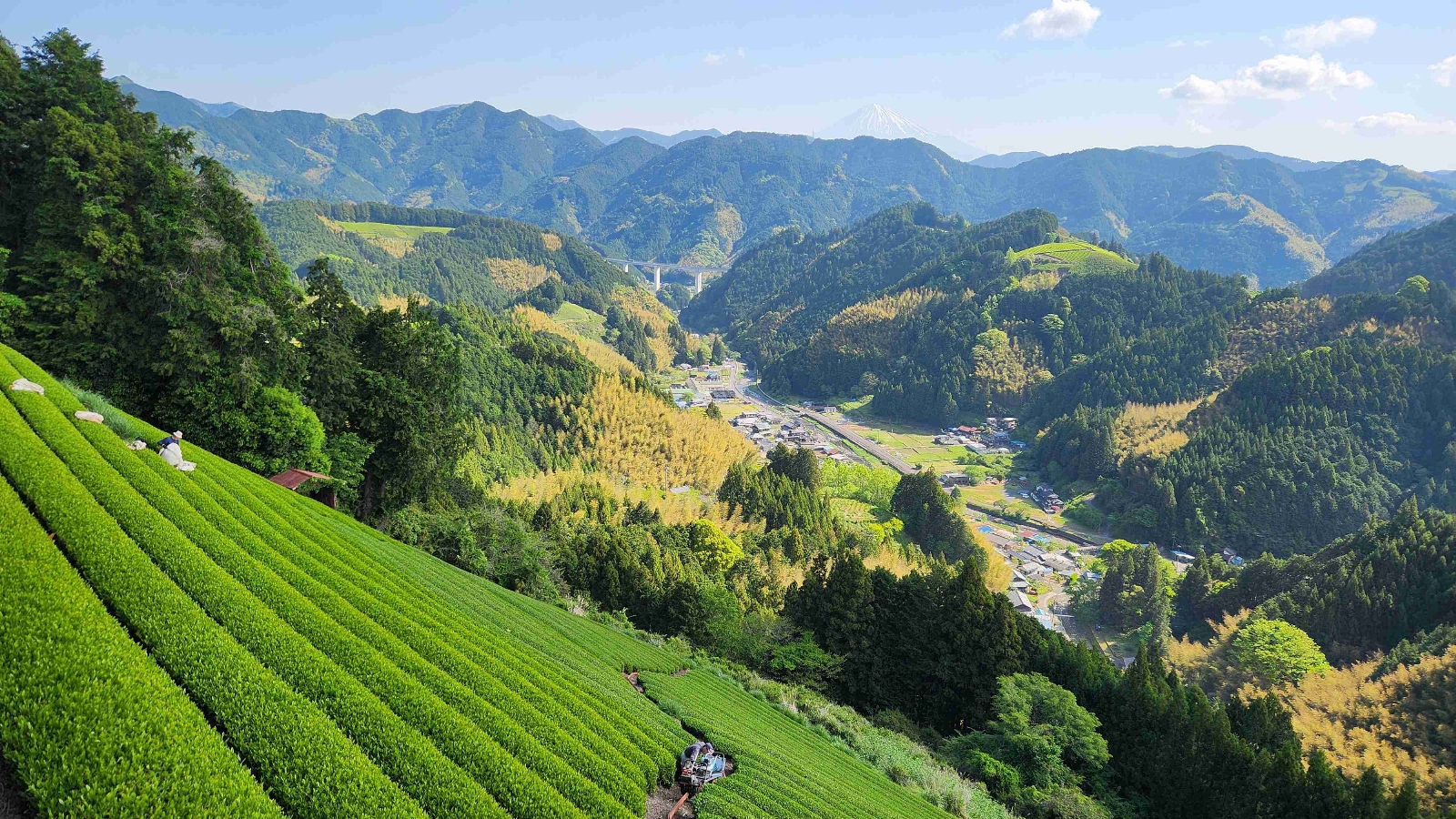 空に浮いているかのような茶畑。近隣の山々が高い位置から見渡せる。
