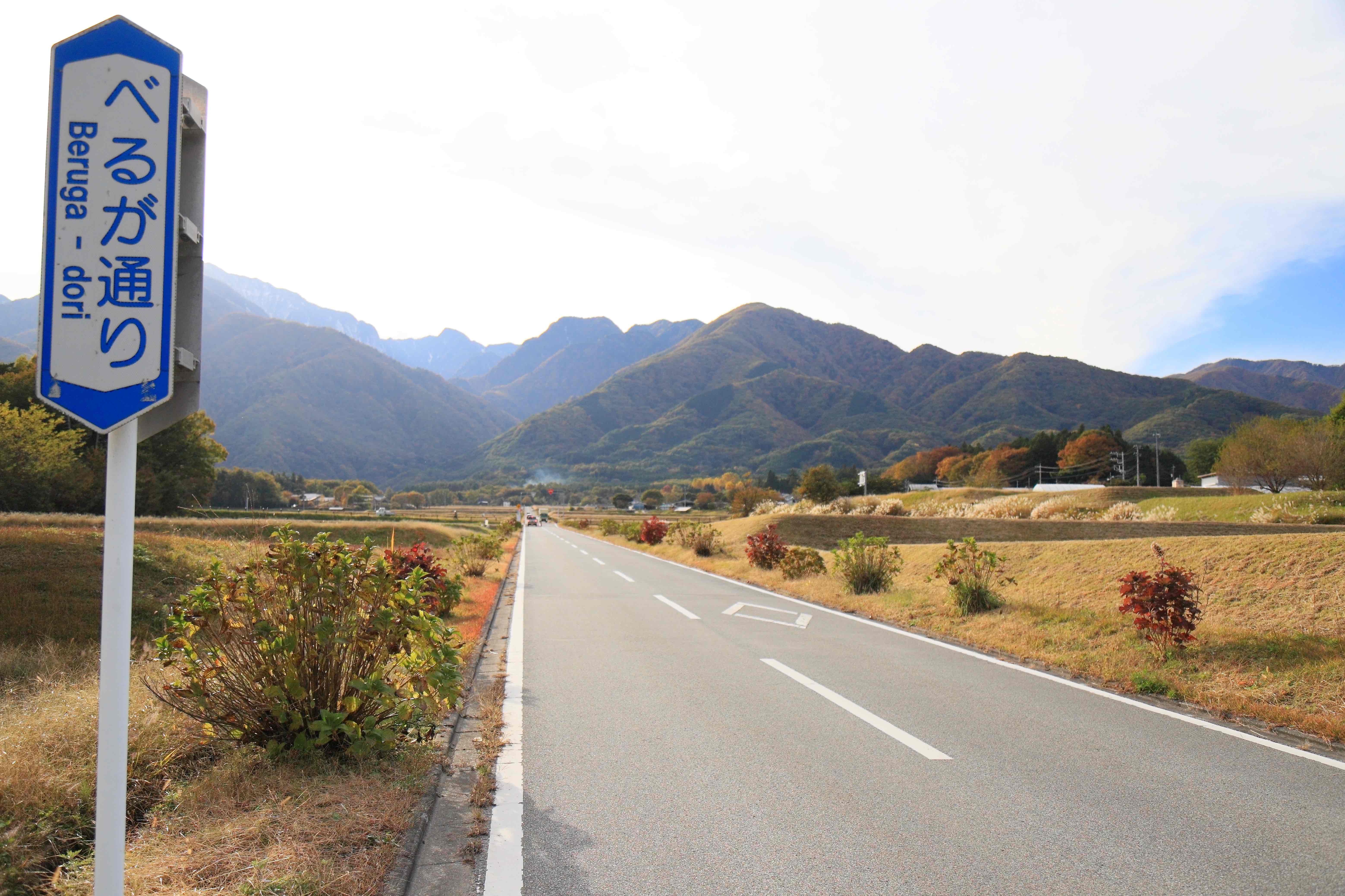 真正面から甲斐駒ヶ岳に向かう農道。その斜面に棚田形になっている田んぼも美しい。