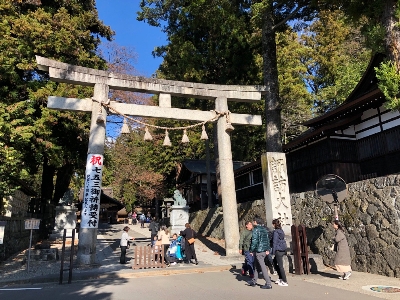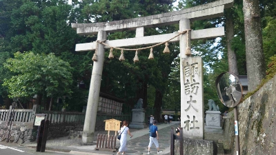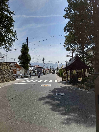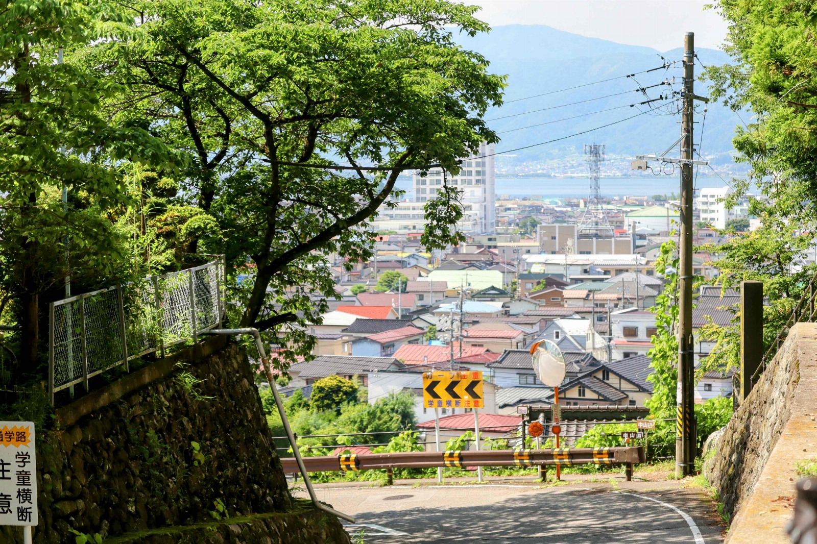下諏訪町の街並みと諏訪湖を背景に楽しめる一本桜。