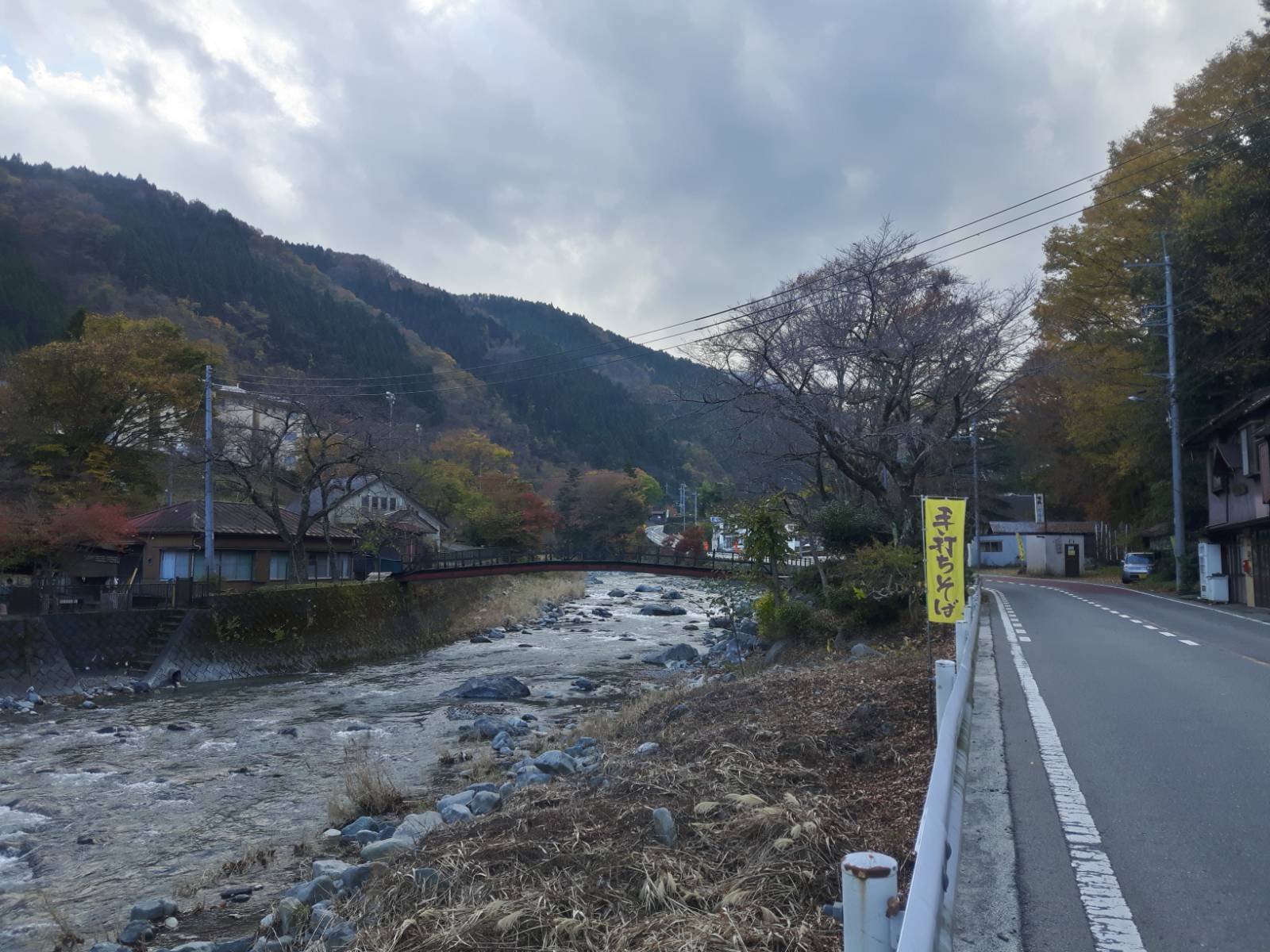 道志川と平行する気持ちのいい場所。手前でトイレもあり、休憩に最適。