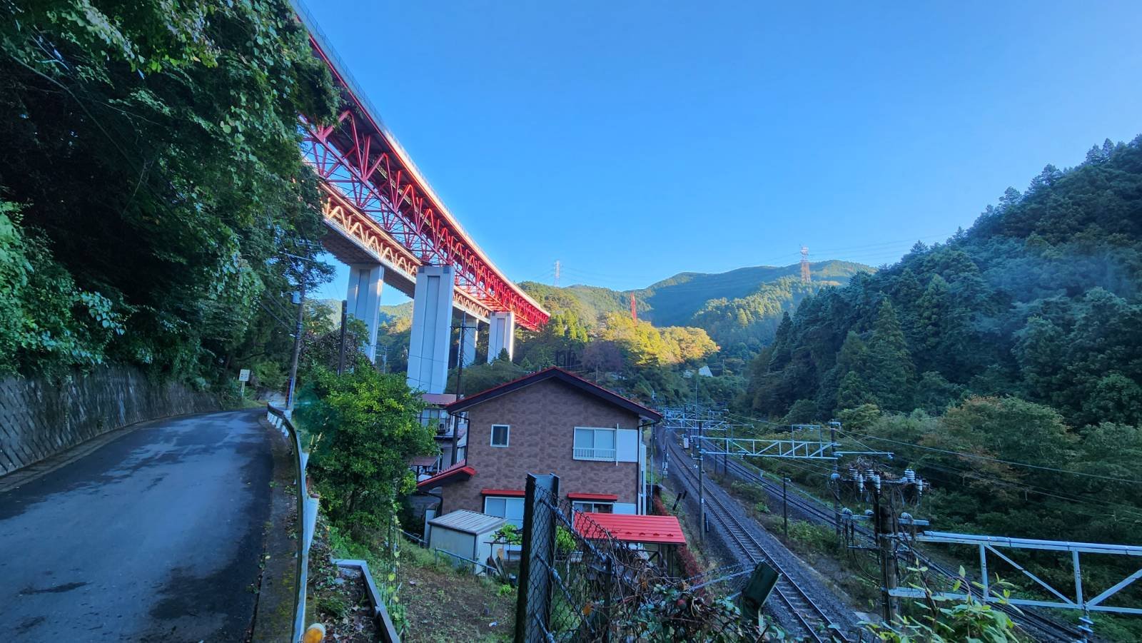 中央高速道路の下をくぐる道。真赤の巨大な橋の存在感が圧倒的。