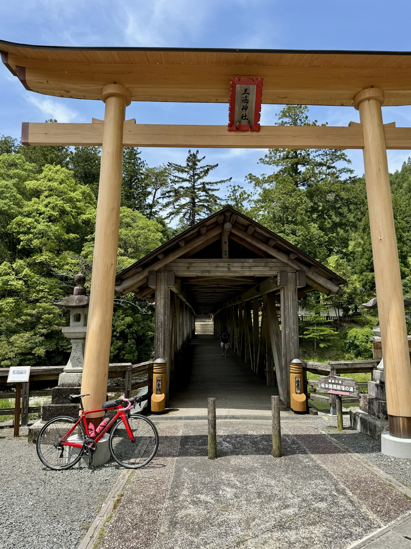 坂本龍馬にもゆかりのある三嶋神社と、そこにかかる屋根付きの御幸橋。