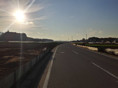川越南の田舎を感じさせるずっと続く気持ちの良い道。路面も綺麗で、ずっとまっすぐで、宅地のある旧道に平行しているので、交通量もそれほど多くない。
