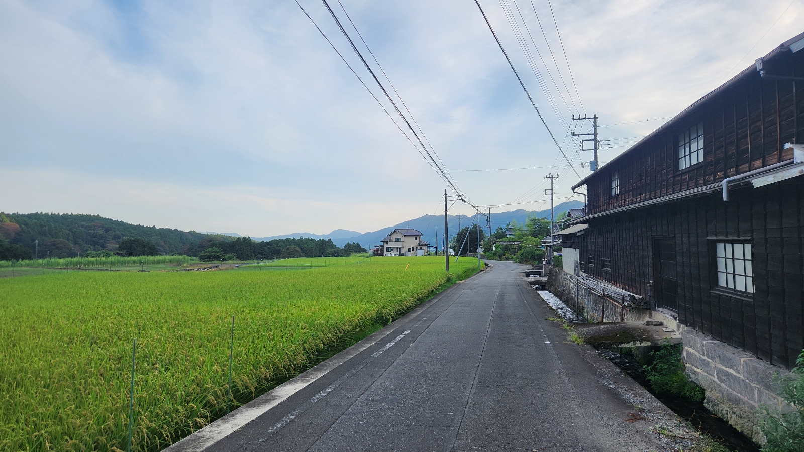 田んぼに直面する大きな古民家の前をすり抜ける、懐かしさ溢れる場所。