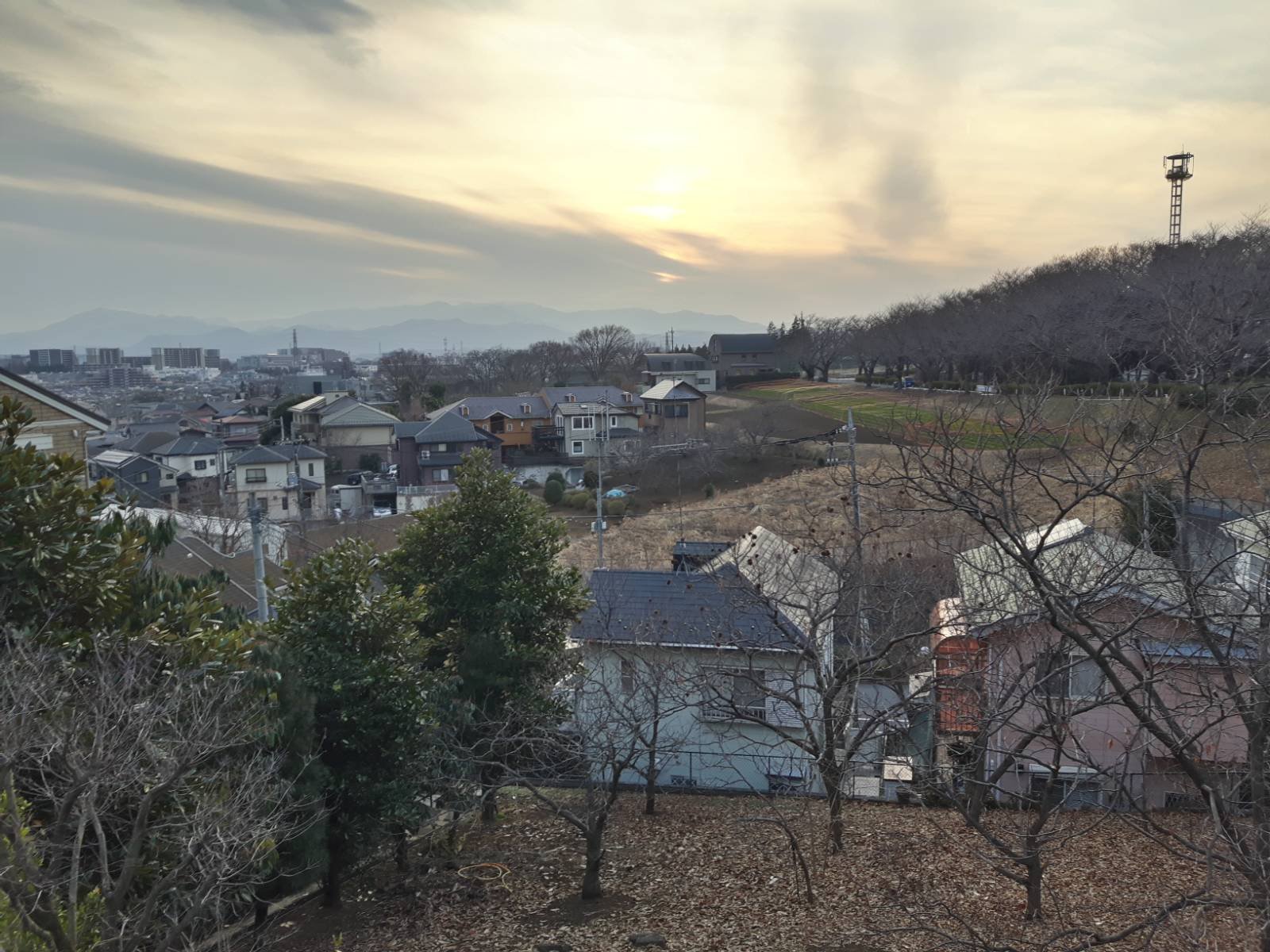 町田の街並みと丹沢山地を一望できる見晴台。桜の木が立ち並び、春になると菜の花も。