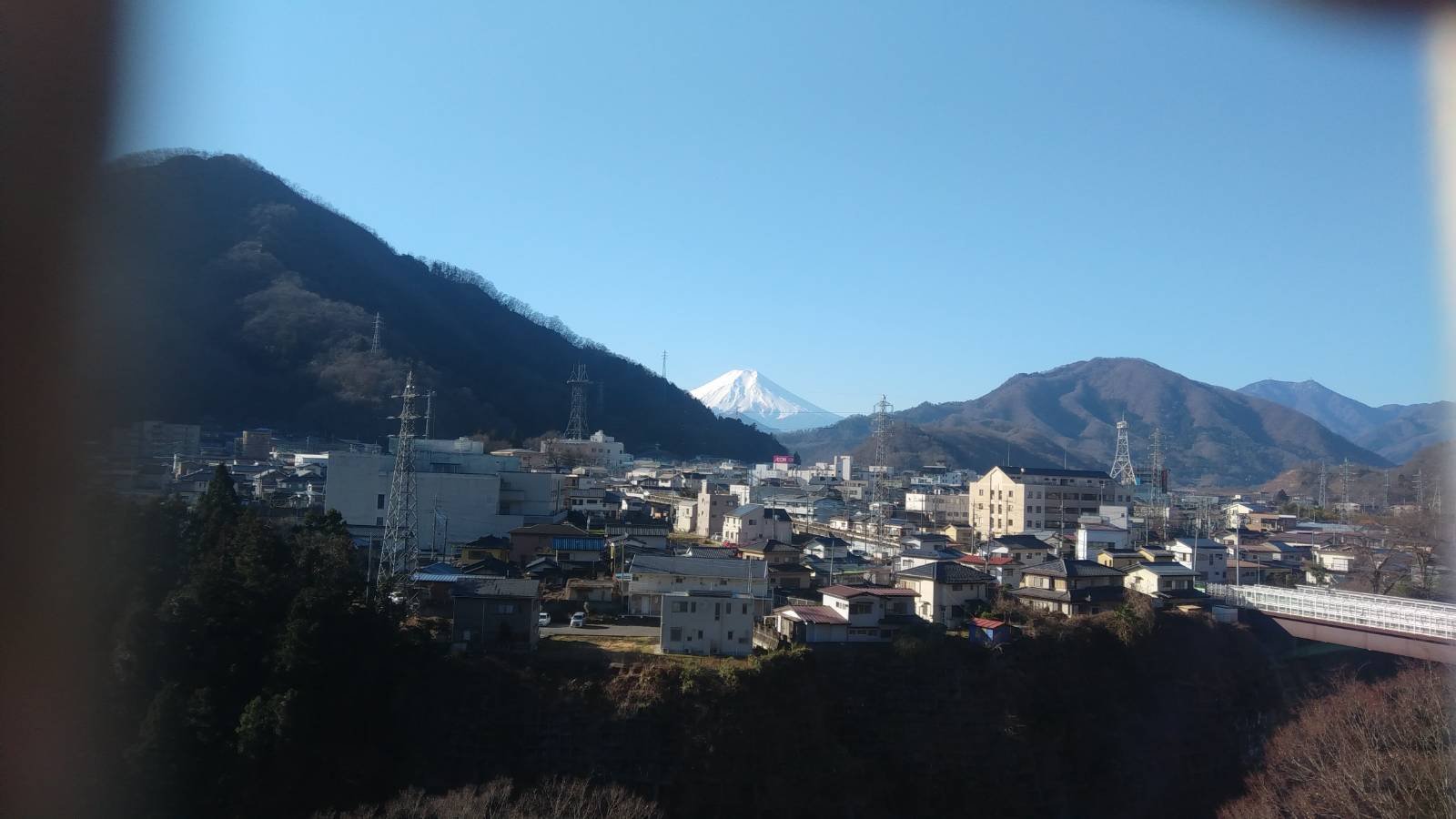 相模川の対岸にある高台から、富士山を背景に、大月市街を一望できる。