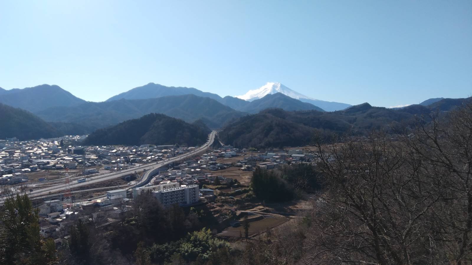 都留の街並み越しに見える雄大な富士山の絶景スポット。