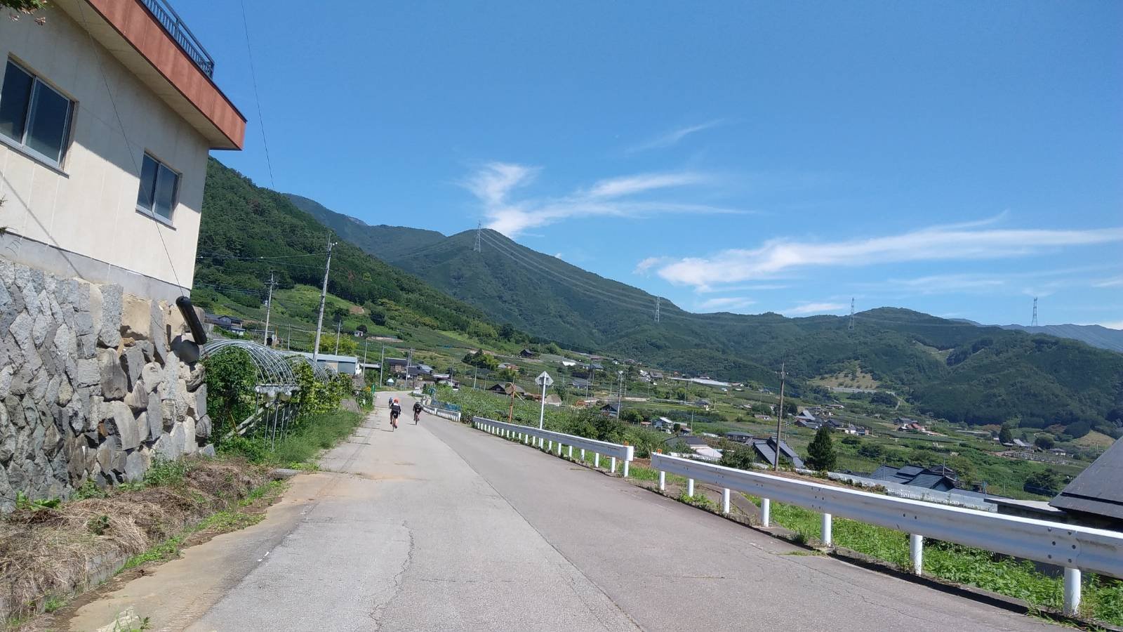 斜面中に広がるブドウ畑とブドウ農家の古い街並みをすり抜ける区間。山梨を感じる。