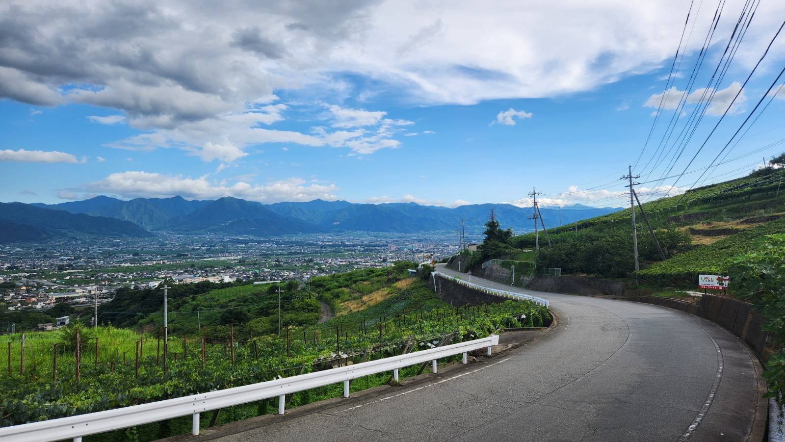 甲府盆地の上を行くフルーツラインの絶景スポットのひとつ。晴れの日は富士山に甲府の街並みを一緒に見下ろすことができる。