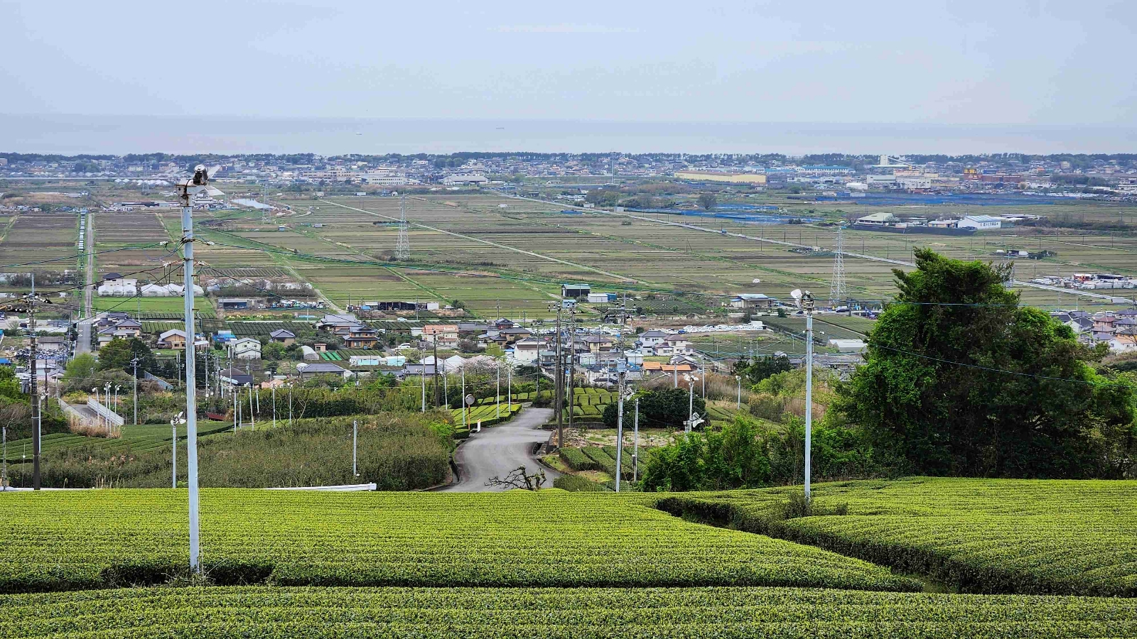 芦川山麓は茶畑の一面、そして平野は田んぼの一面が続き、その奥には駿河湾と伊豆半島もくっきりと。