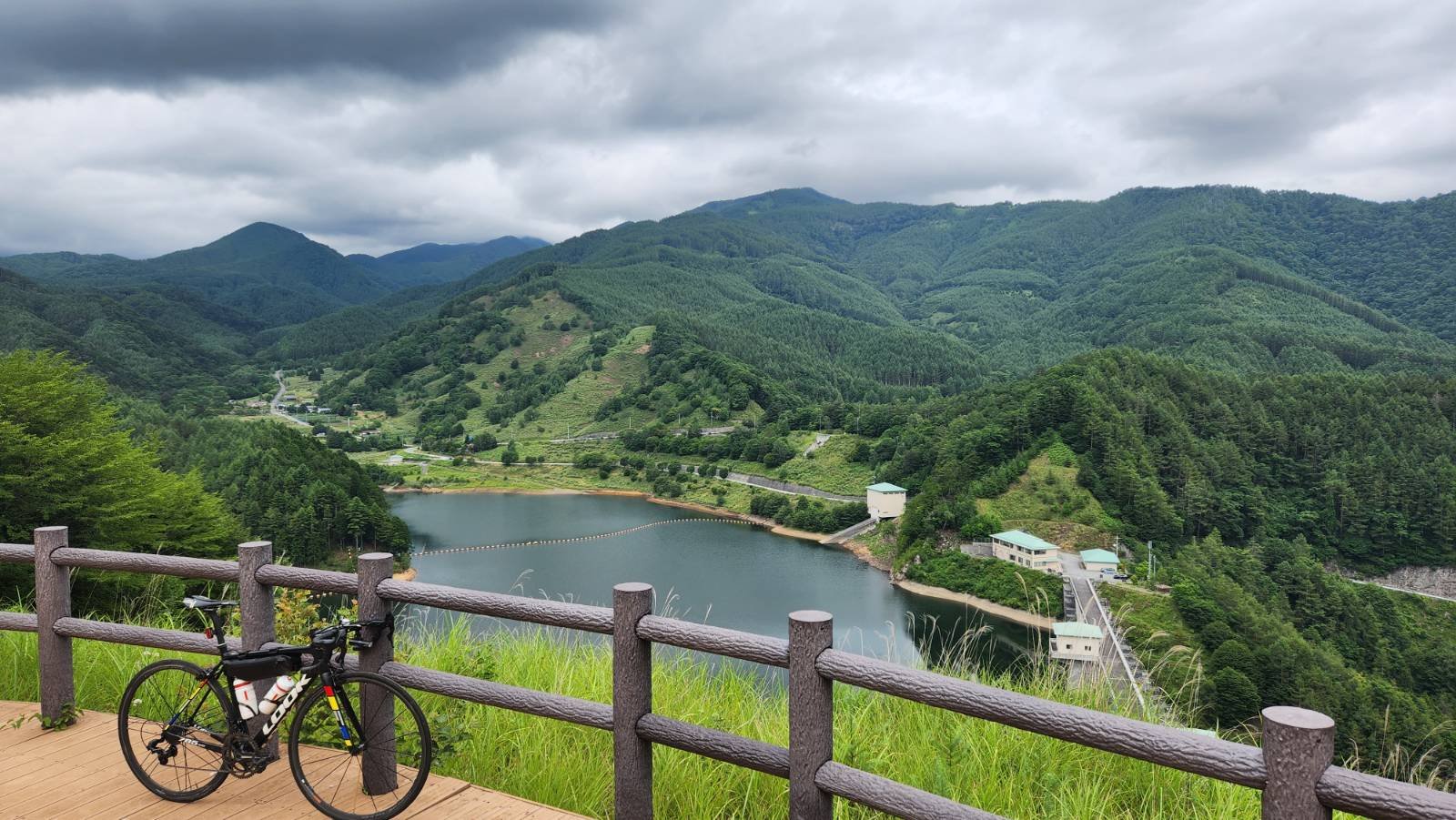 乙女湖と金峰山を見下ろす山奥の展望台。焼山峠から山に向かって約2km走っていくと、道の終点と共に突然現れる。
